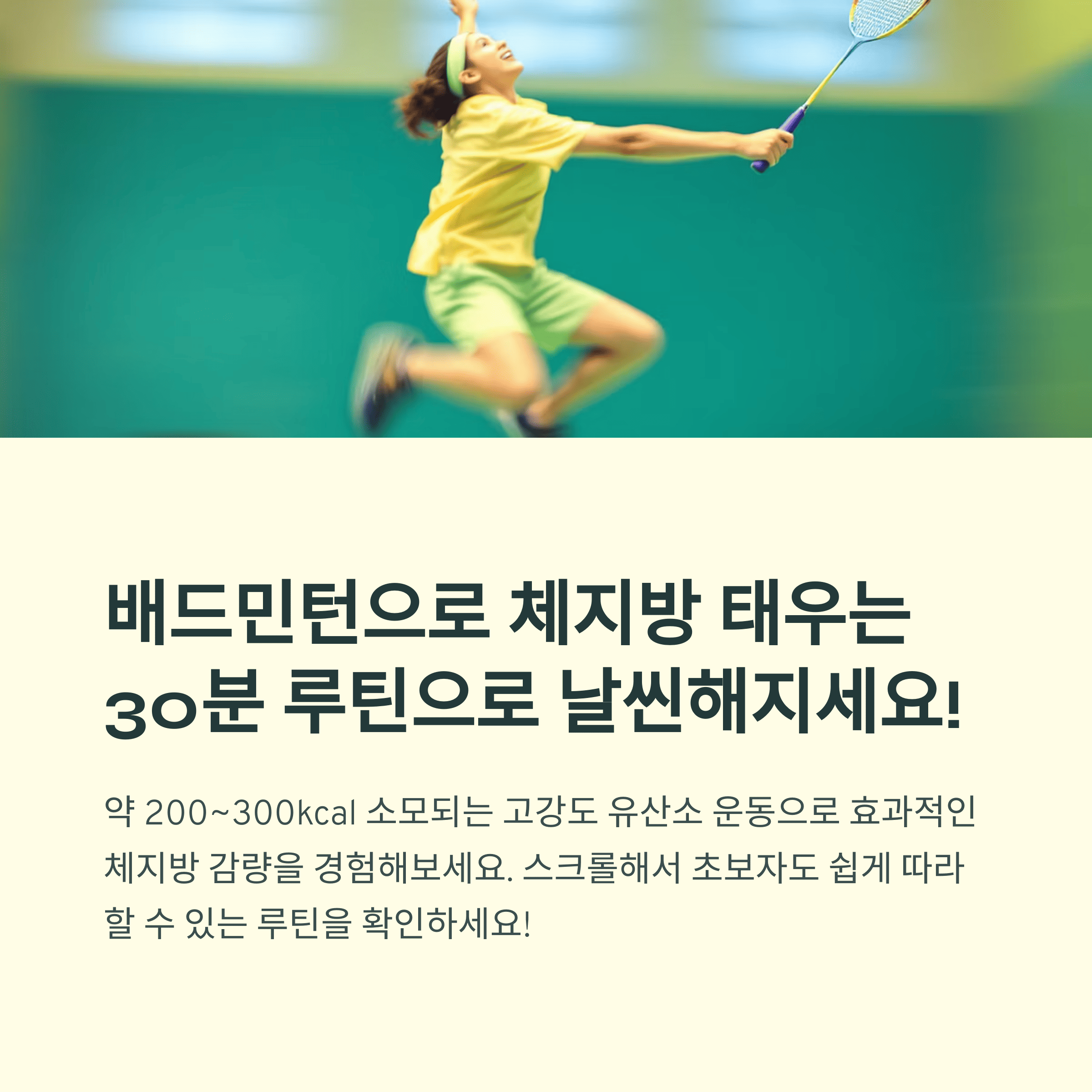 배드민턴은 순간적인 방향 전환, 점프, 전신 움직임이 반복되는 고강도 유산소 운동입니다.