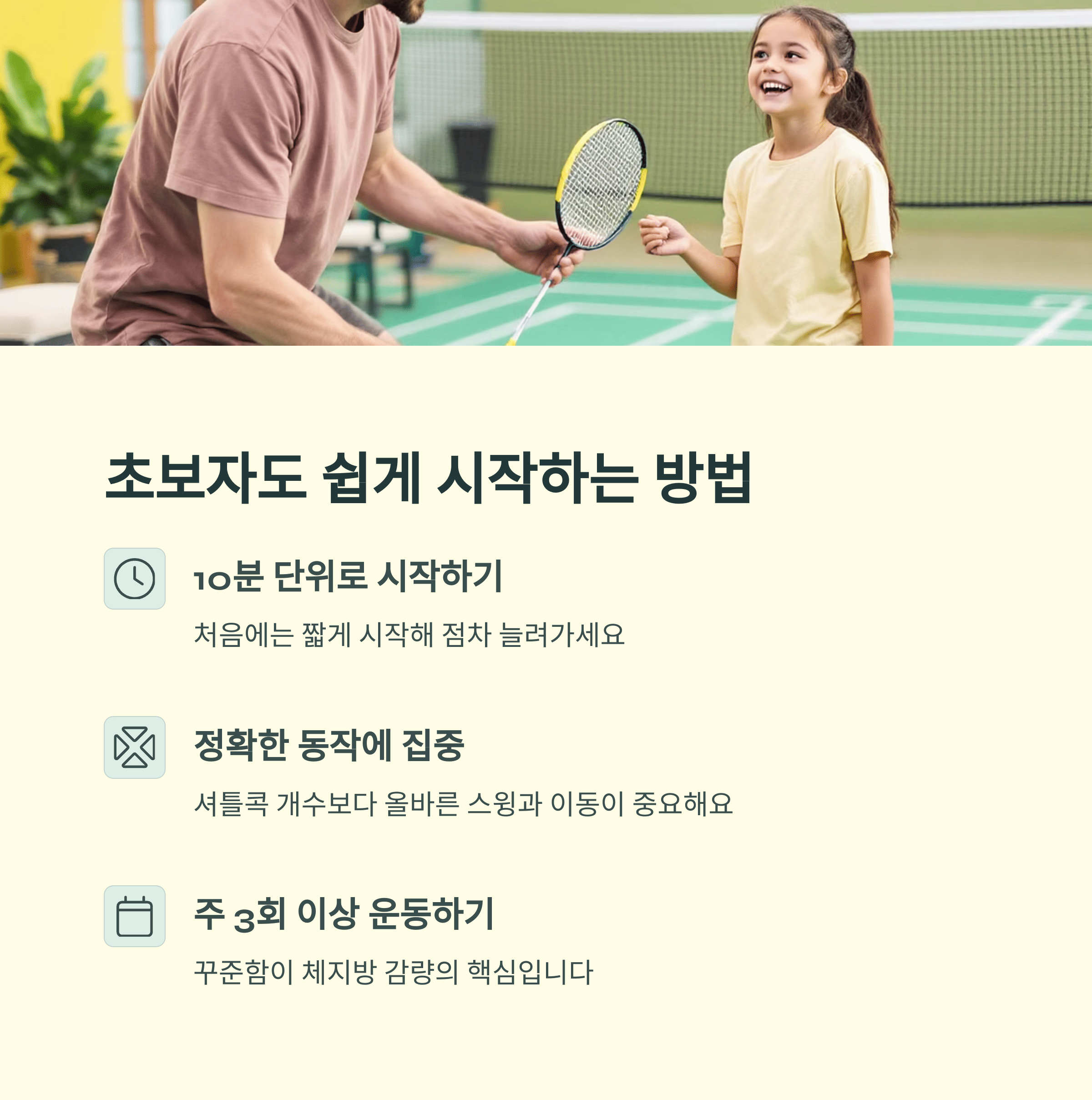 • 셔틀콕 개수 늘리기보다, 정확한 스윙과 위치 이동에 집중하세요.