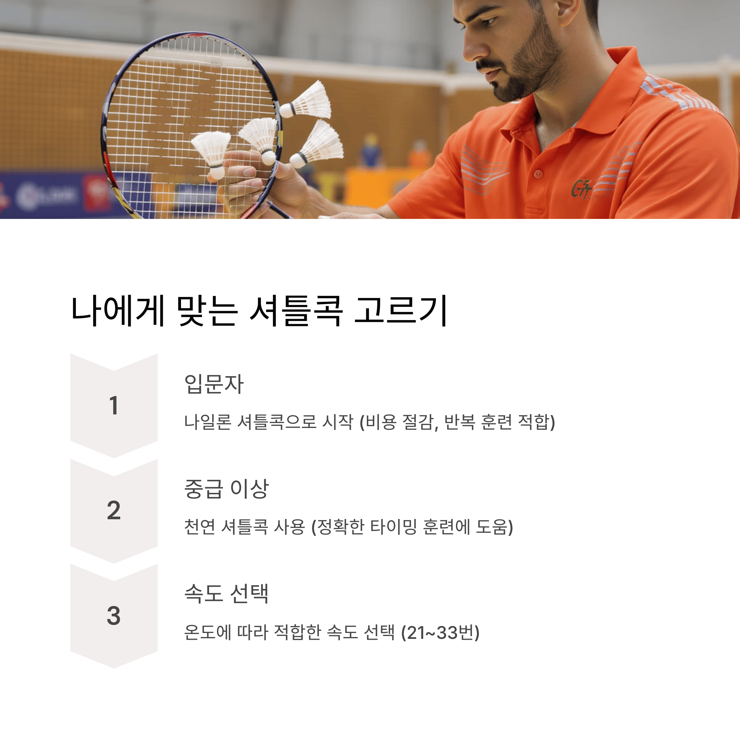 1. 입문자: 나일론 셔틀콕으로 시작 → 비용 절감 & 반복 훈련 적합