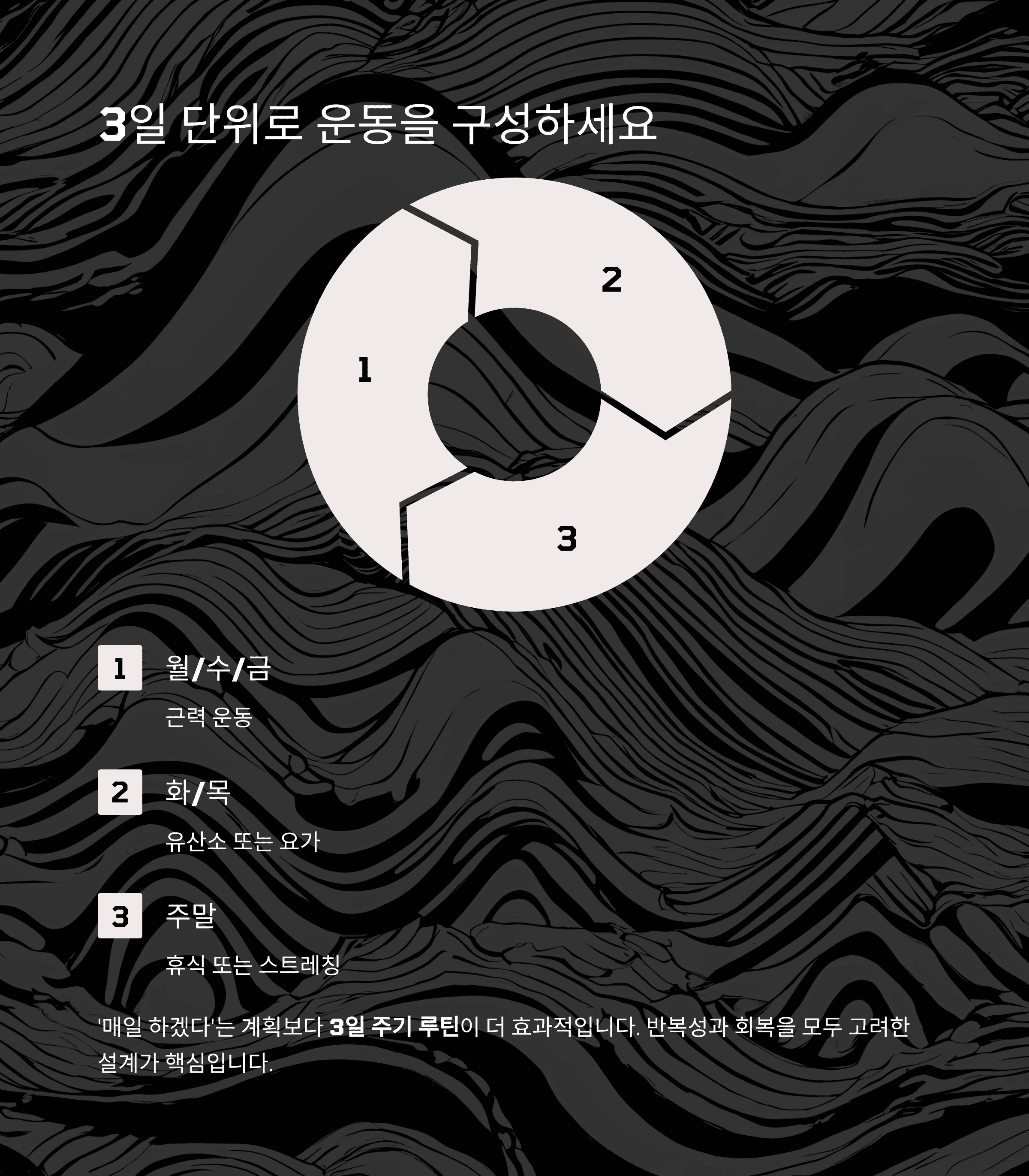 예: 월/수/금 근력운동 + 화/목 유산소 or 요가 → 주말은 휴식 또는 스트레칭 반복성과 회복을 모두 고려한 설계가 핵심입니다.