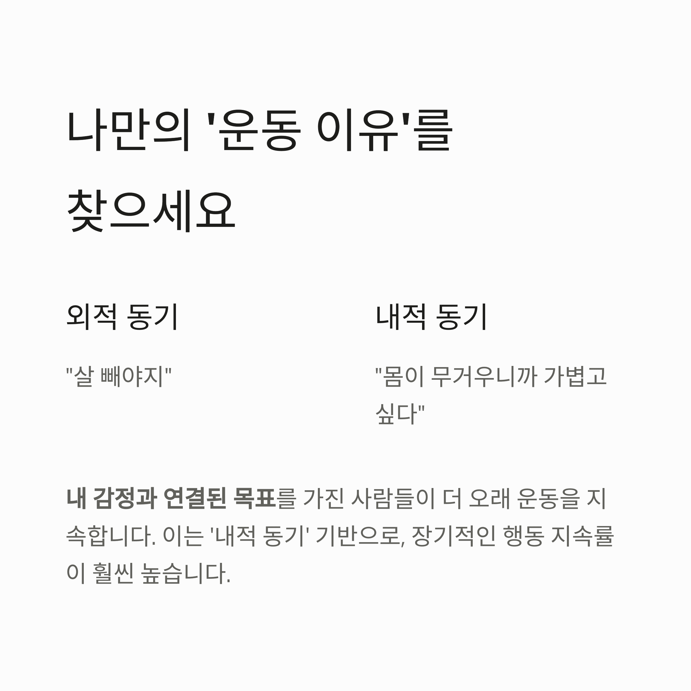 “살 빼야지”보다 “몸이 무거우니까 가볍고 싶다”처럼 내 감정과 연결된 목표를 가진 사람들이 더 오래 운동을 지속합니다.