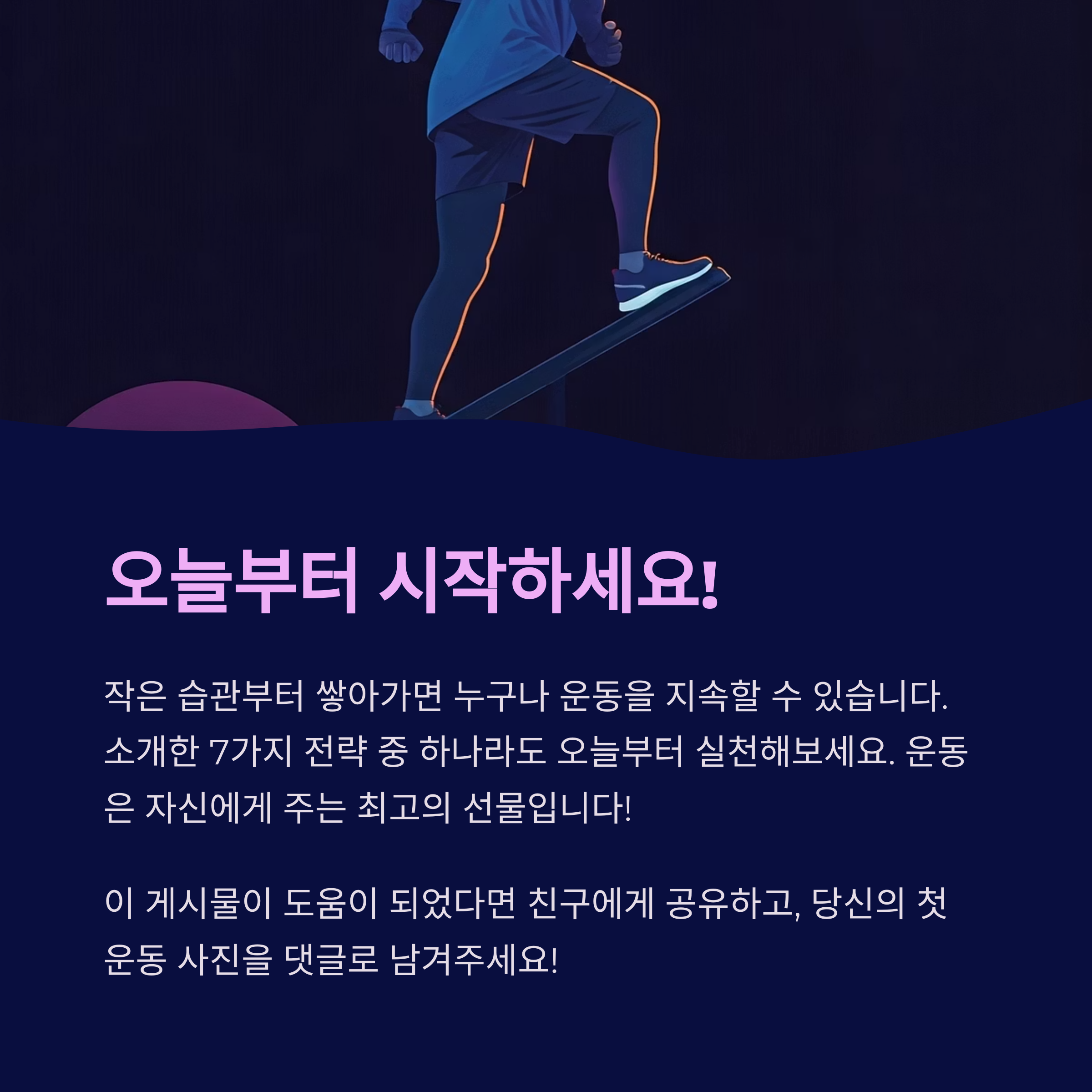 운동을 시작하는 것은 쉽지 않지만, 작은 습관부터 쌓아간다면 누구나 지속할 수 있습니다.
