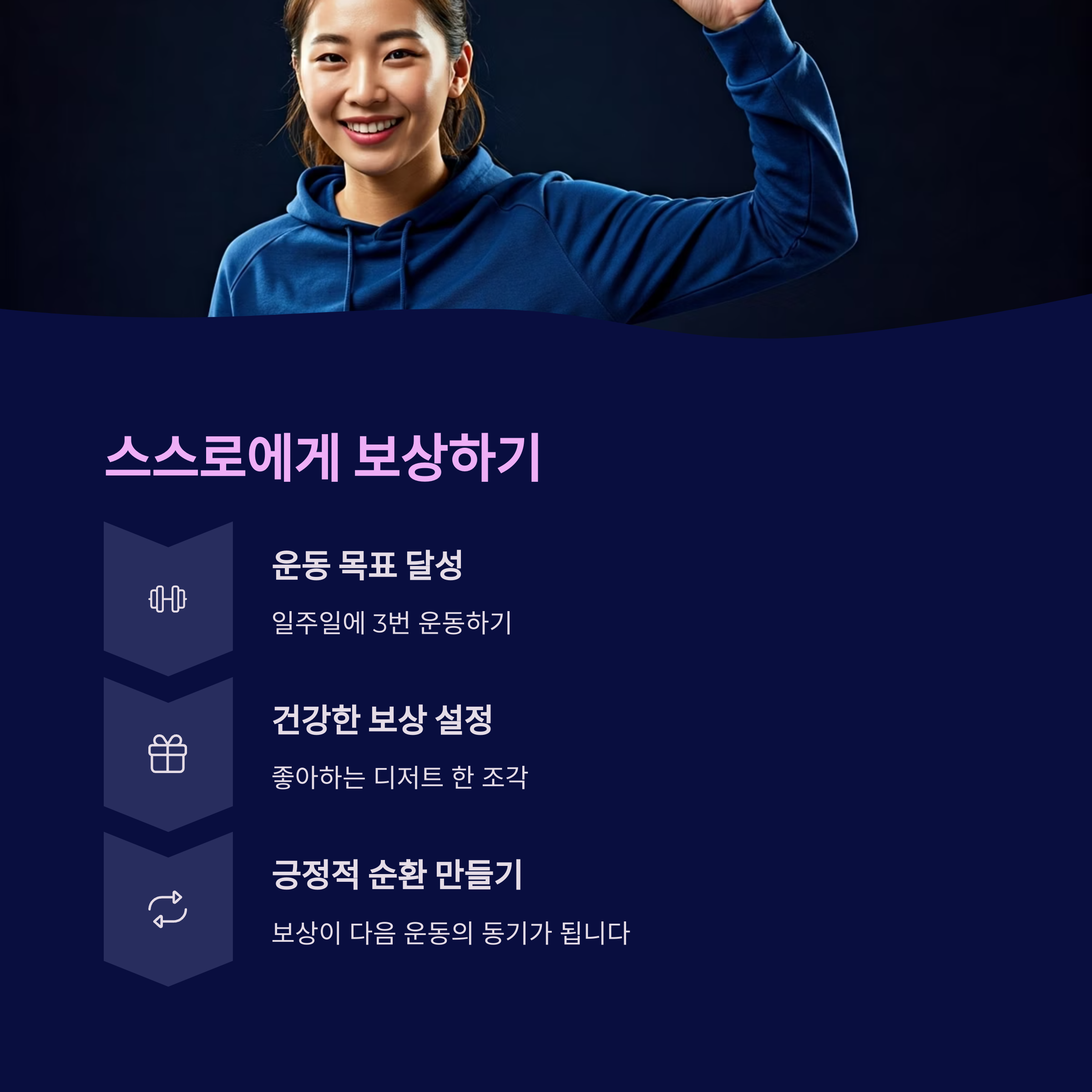 “일주일에 3번 운동하면 좋아하는 디저트를 하나 먹기” 같은 보상 시스템을 설정하면 긍정적인 자극이 됩니다.