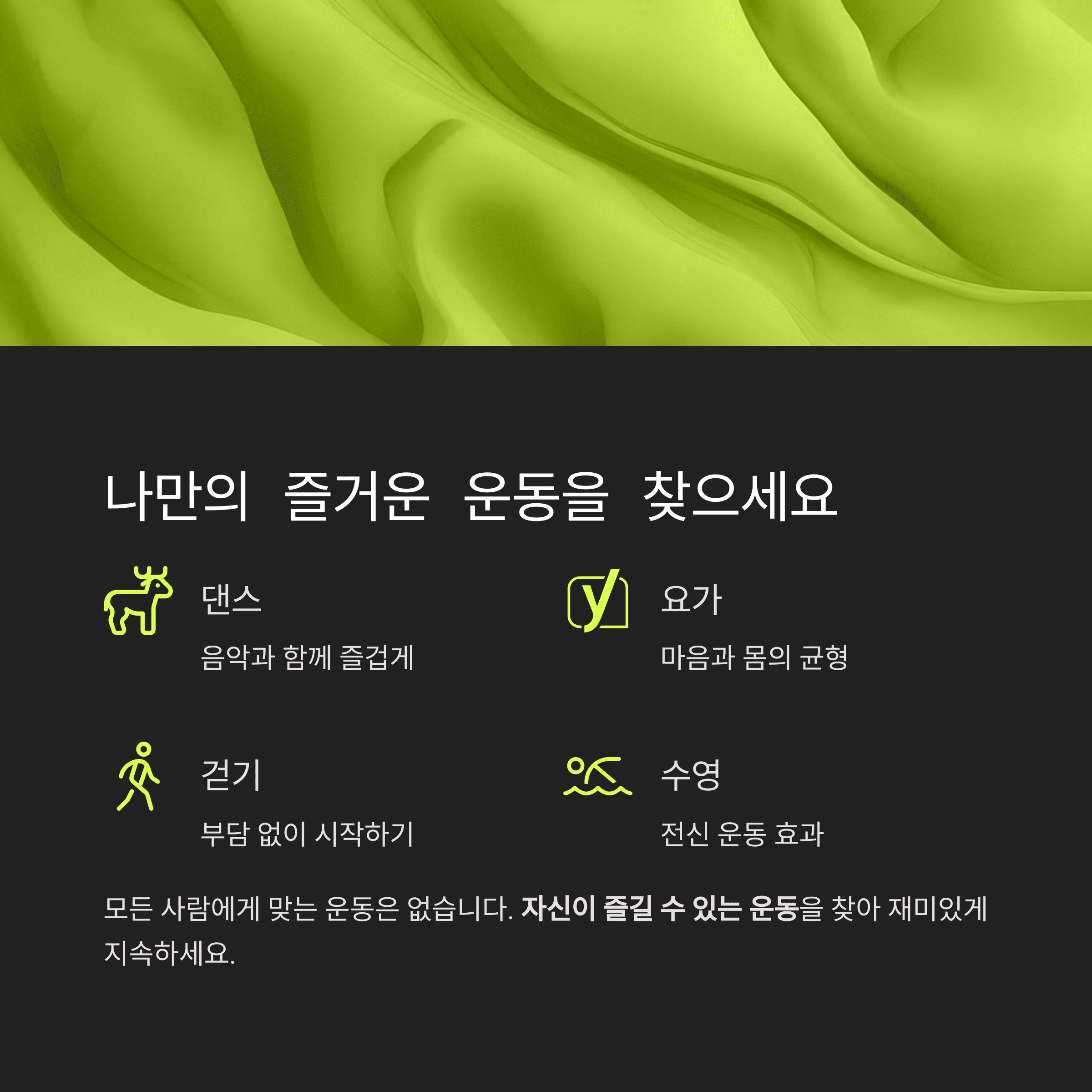 댄스, 필라테스, 요가, 걷기 등 자신이 즐길 수 있는 운동을 먼저 찾는 것이 중요합니다.
