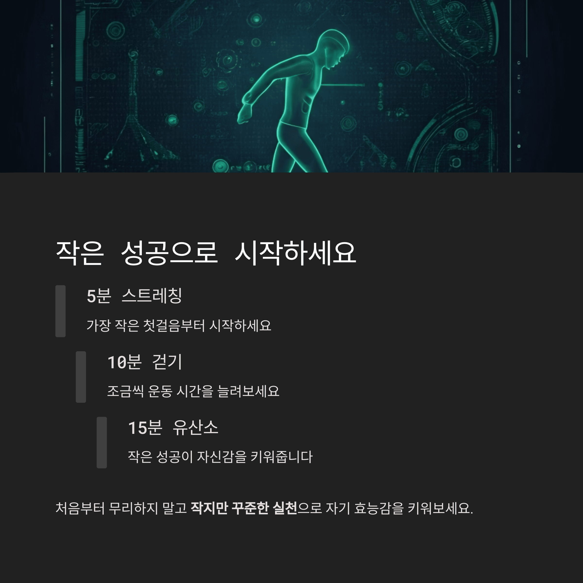 운동을 시작하는 것은 쉽지 않지만, 작은 습관부터 쌓아간다면 누구나 지속할 수 있습니다.