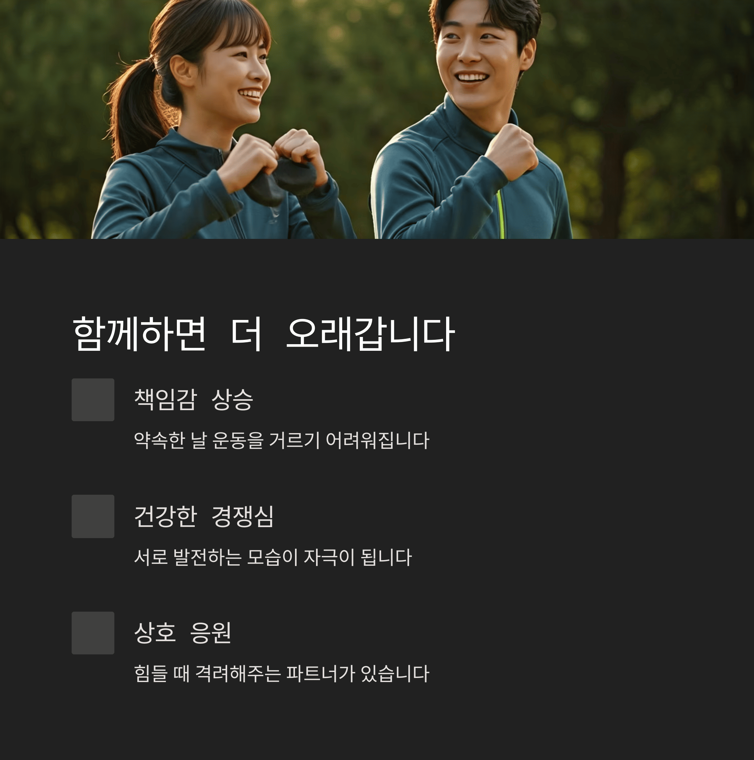운동 파트너가 있으면 책임감과 경쟁심이 동반되어 동기부여에 큰 도움이 됩니다. 서로의 일정을 공유하고 응원해 주세요.