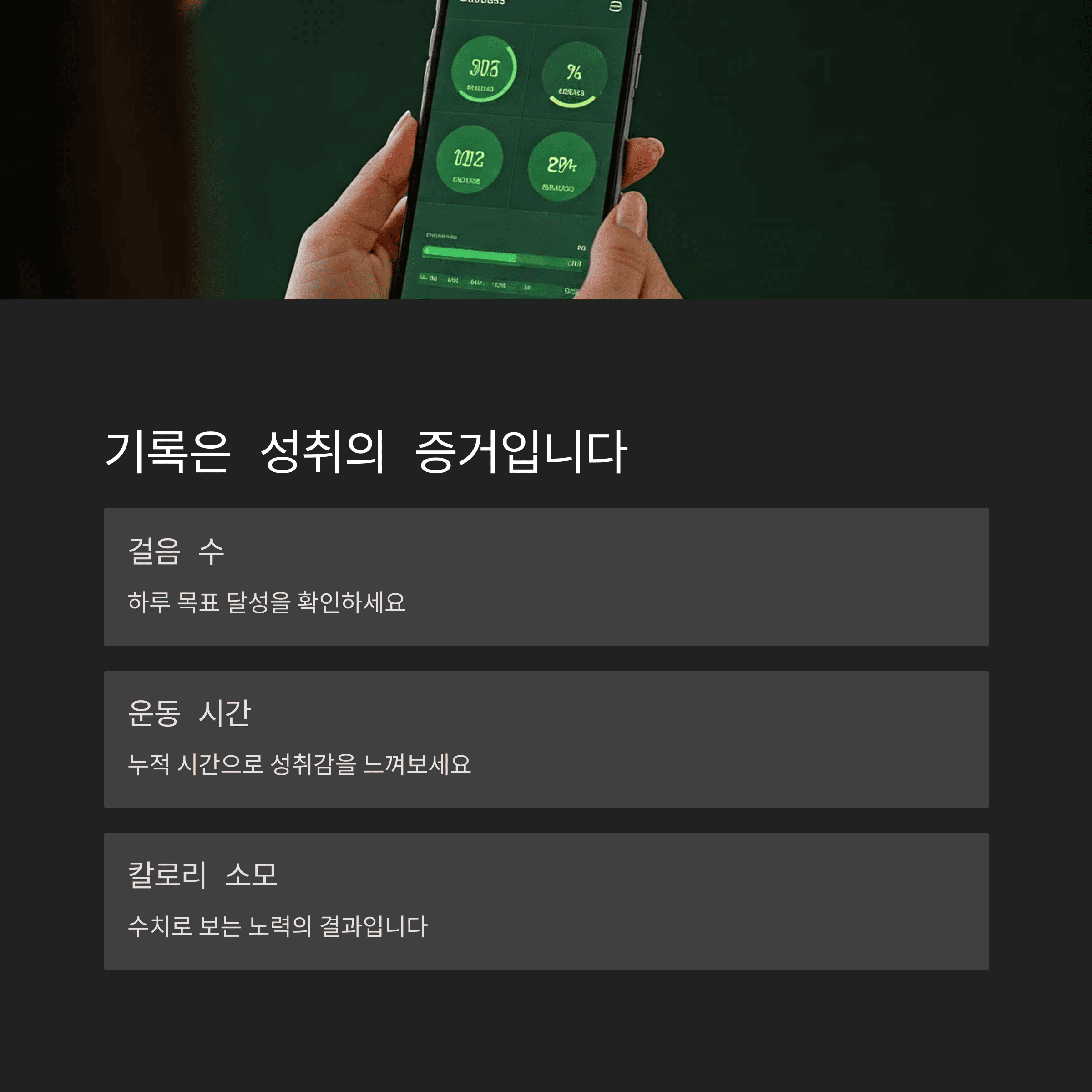 걸음 수, 운동 시간, 칼로리 소모량 등을 기록하면 내가 무엇을 했는지 눈으로 확인할 수 있어 성취감이 커집니다.