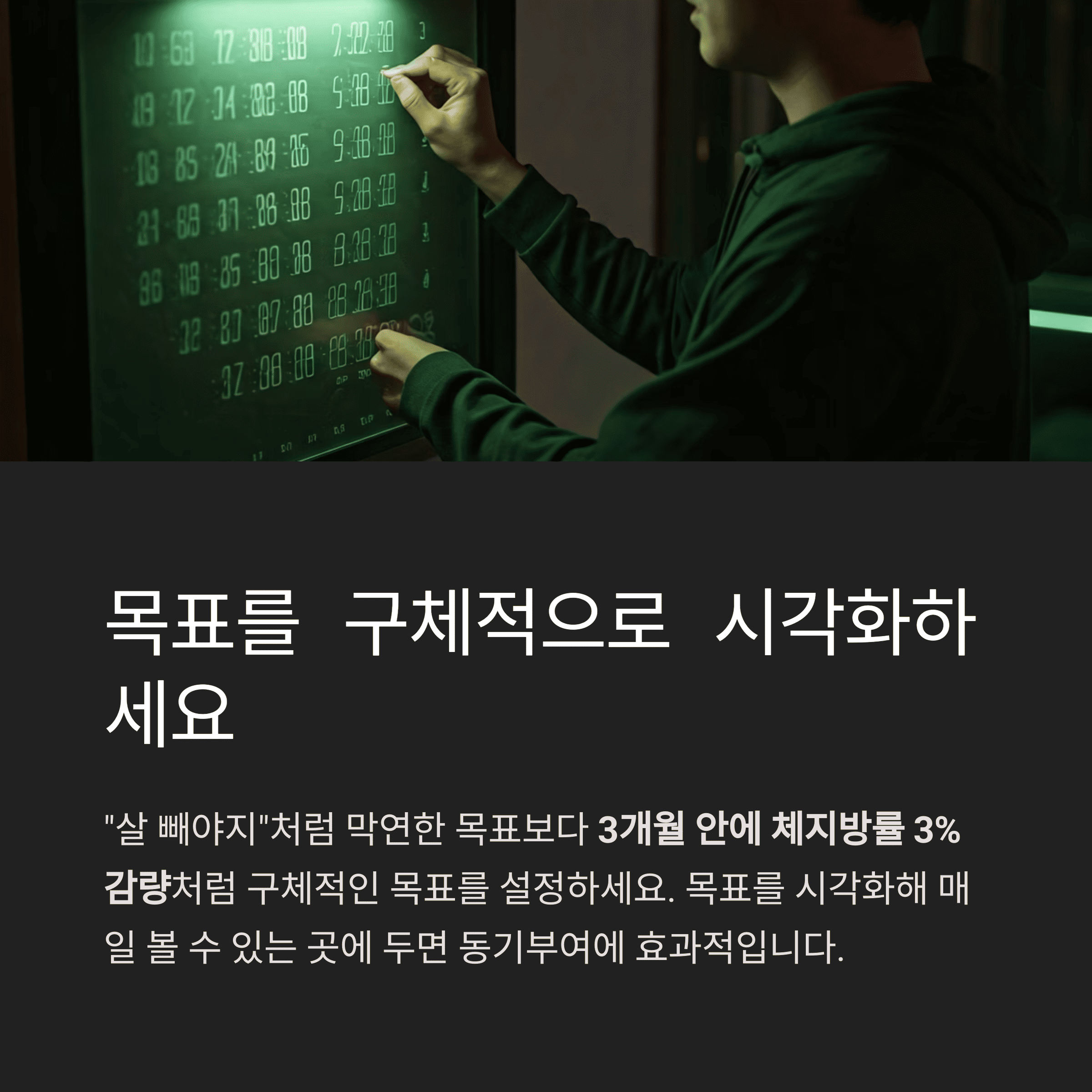 대신, ‘3개월 안에 체지방률 3% 감량’처럼 구체적으로 수치화된 목표를 설정하세요.