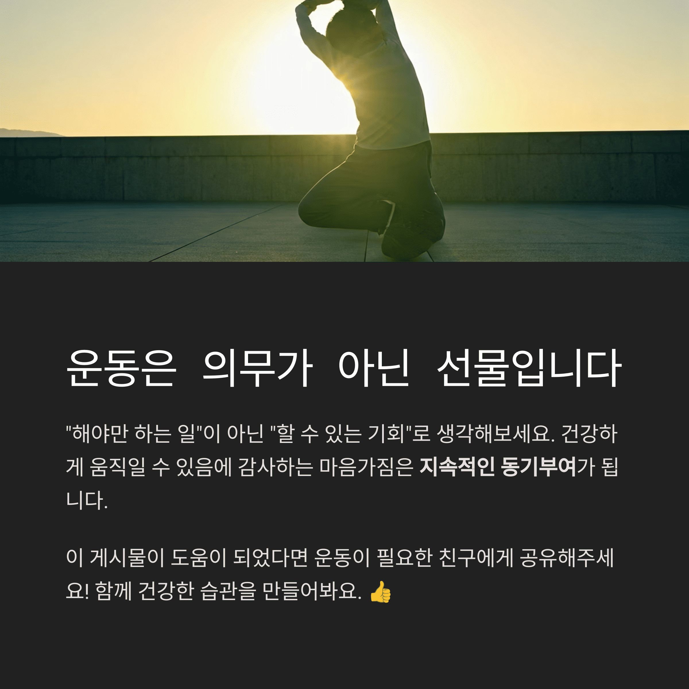 “나는 지금 건강하게 움직일 수 있어서 감사하다”는 생각은 긍정적 감정과 지속적인 동기부여로 연결됩니다.