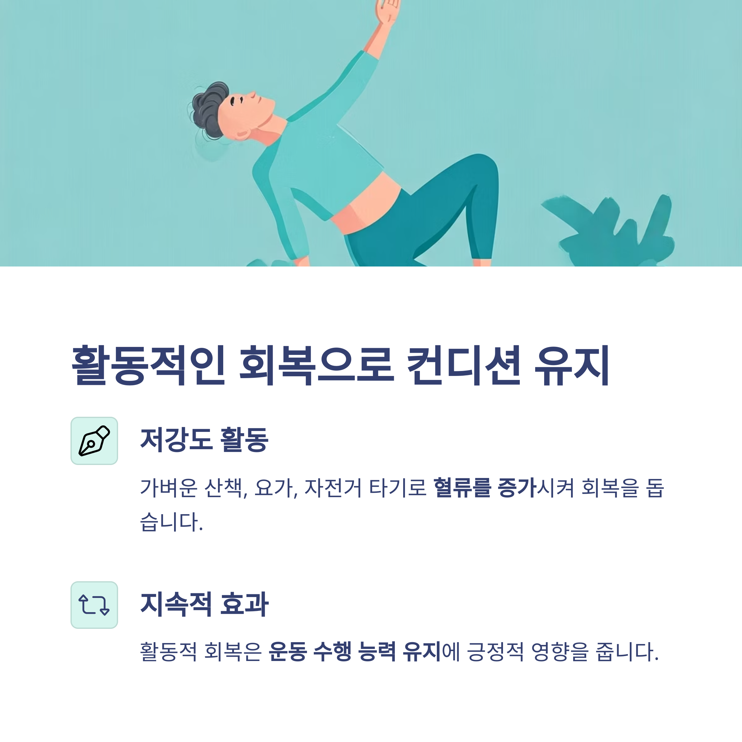 특히 운동 루틴 사이에 활동적인 회복을 포함하면 지속적인 운동 수행 능력 유지에 긍정적인 영향을 줍니다.
