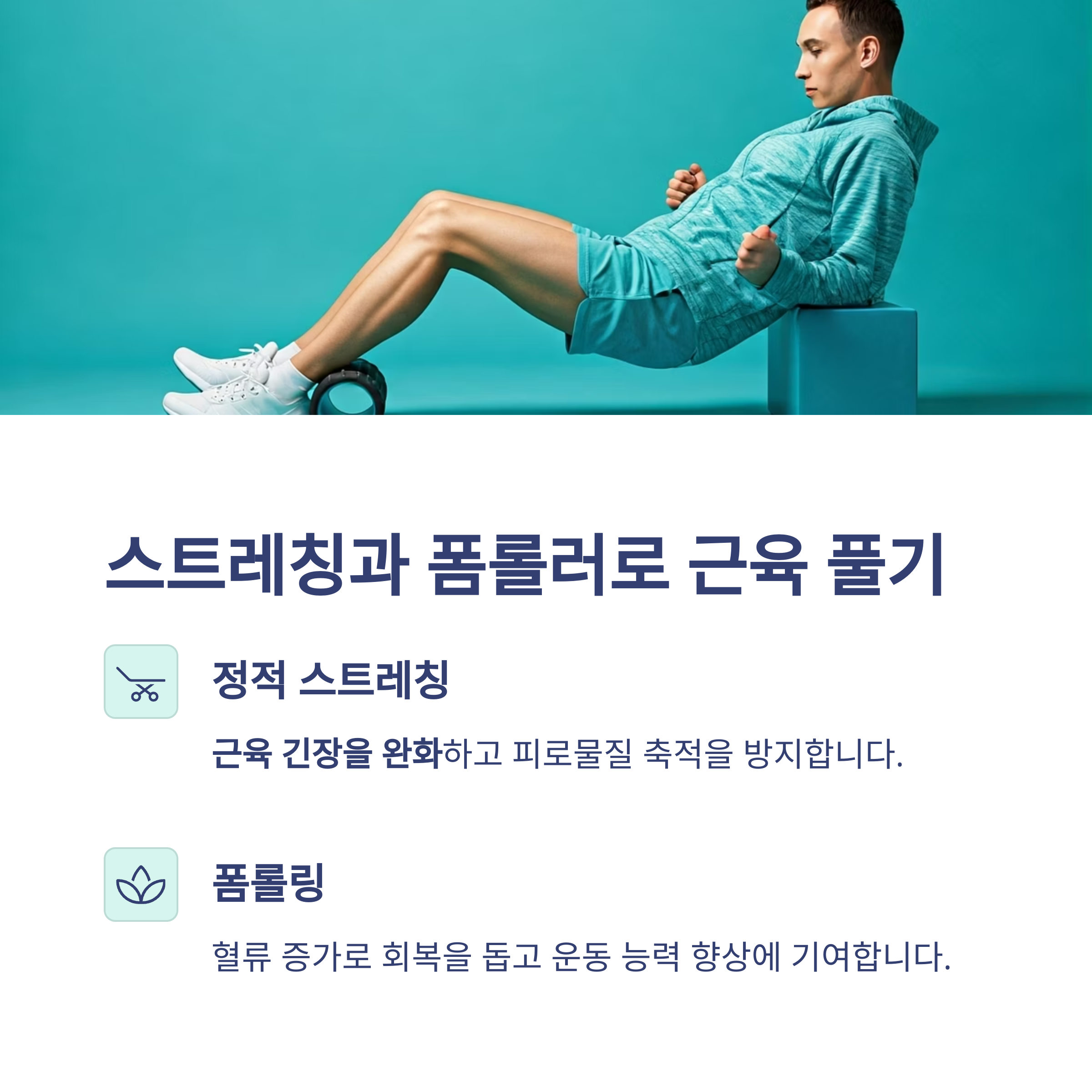 또한, 폼롤러를 활용한 근막이완(foam rolling)은 혈류를 증가시켜 회복을 돕습니다.