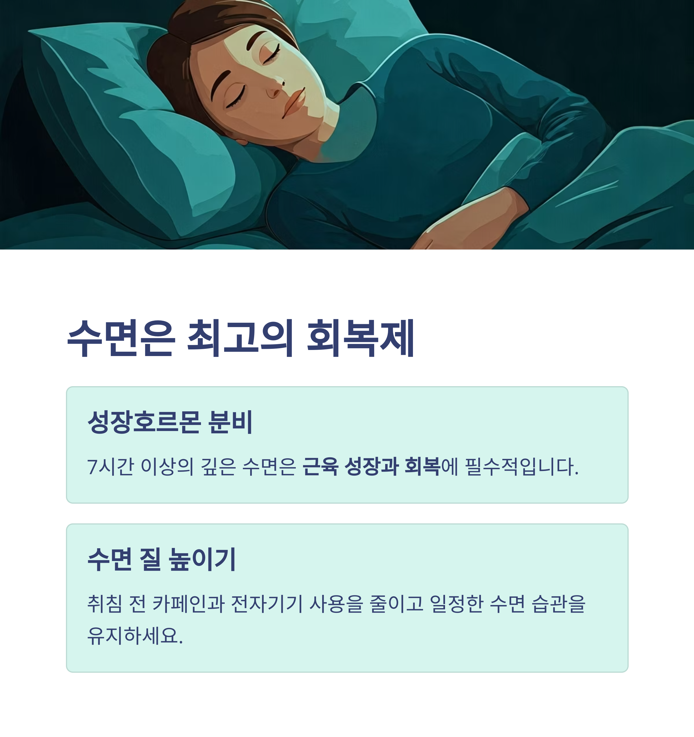 최소 7시간 이상의 깊은 수면은 성장호르몬 분비를 촉진하고 염증을 줄이는 데 중요한 역할을 합니다.