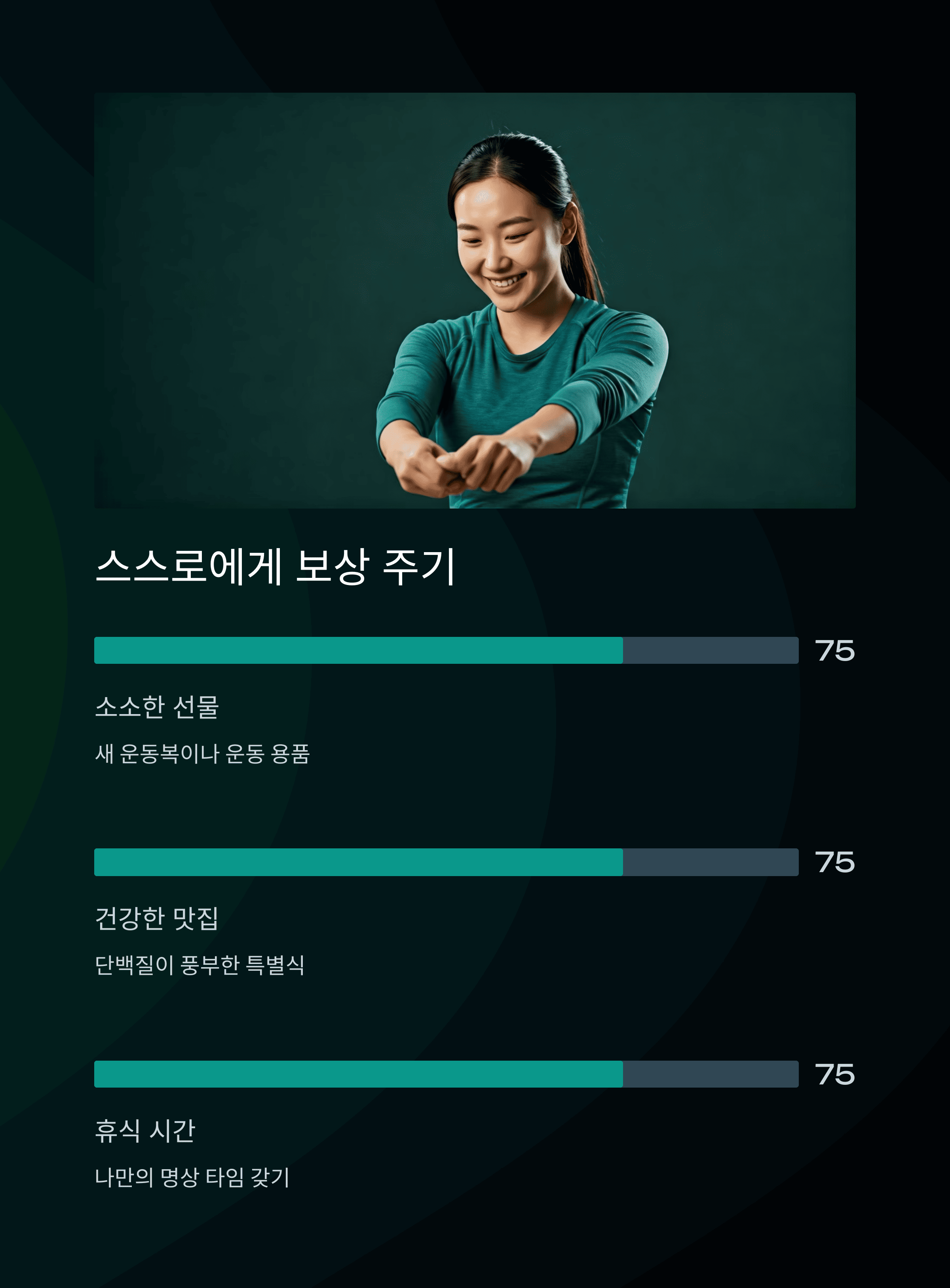 일주일 동안 계획대로 운동을 실천했다면 자신에게 소소한 보상을 주세요.