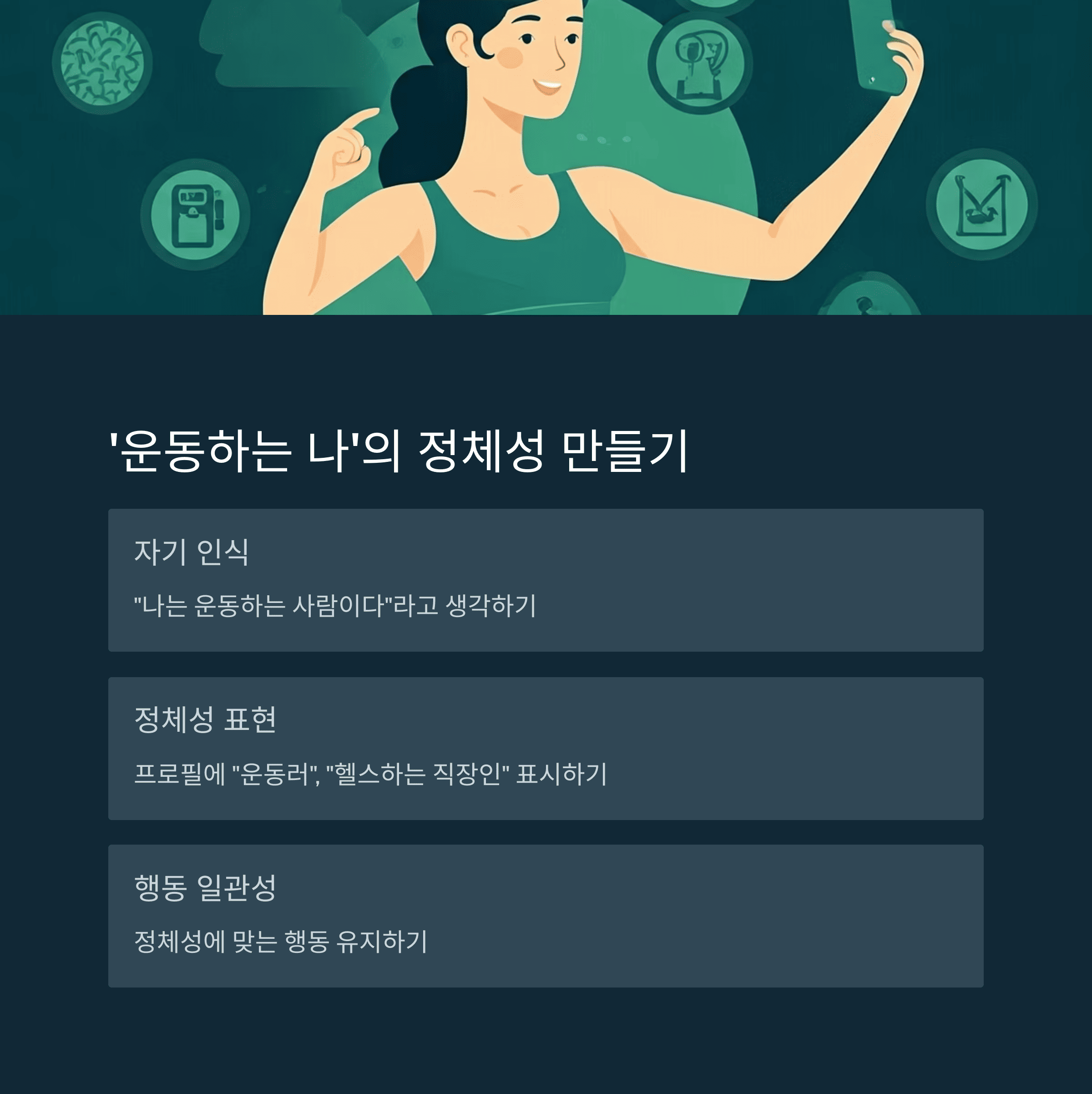 자신을 "운동하는 사람"이라고 인식하면 행동의 일관성을 유지하려는 심리가 작용합니다.