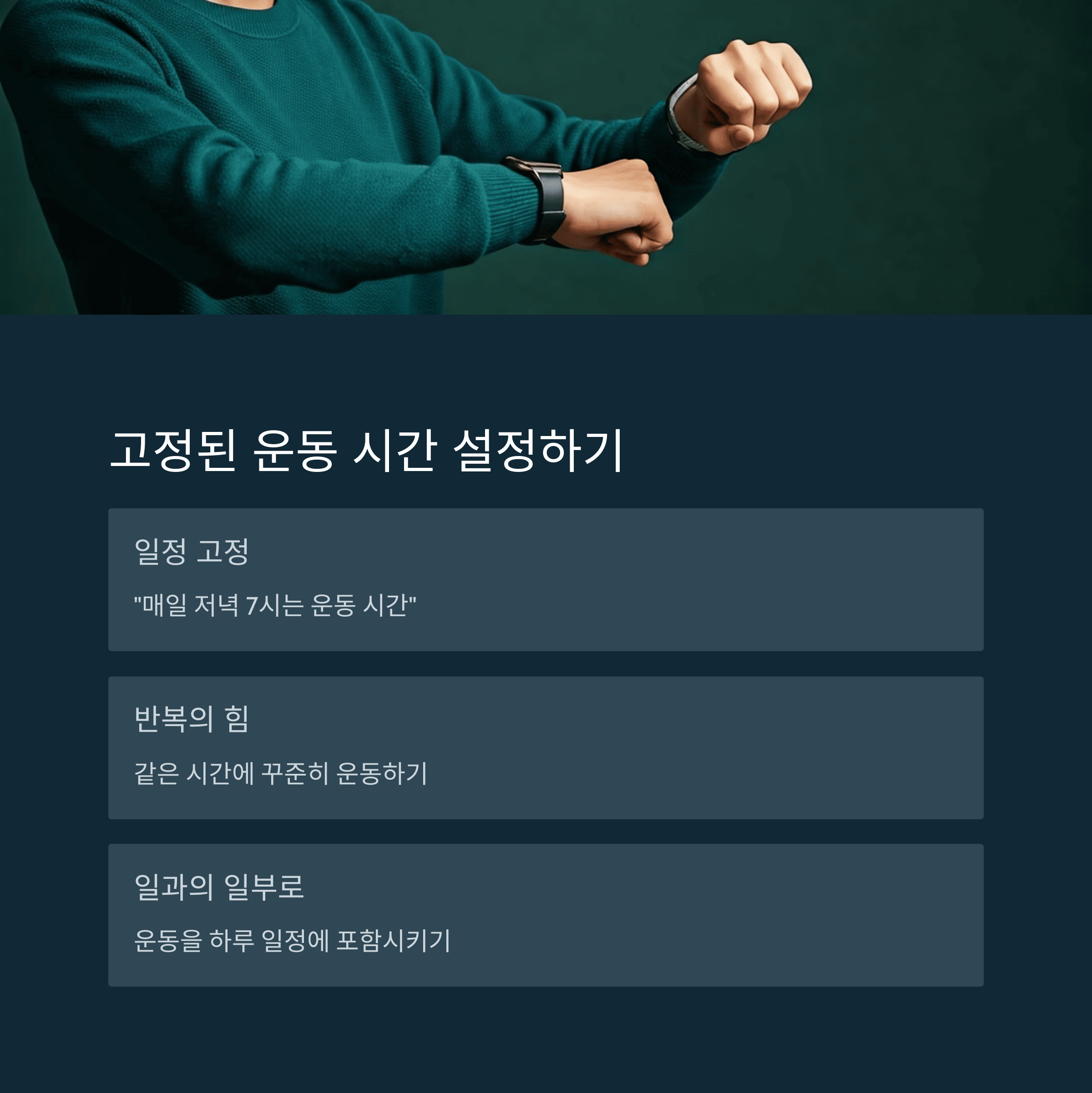 예: “매일 저녁 7시는 운동 시간”처럼 정해진 시간에 반복하는 것이 핵심입니다.