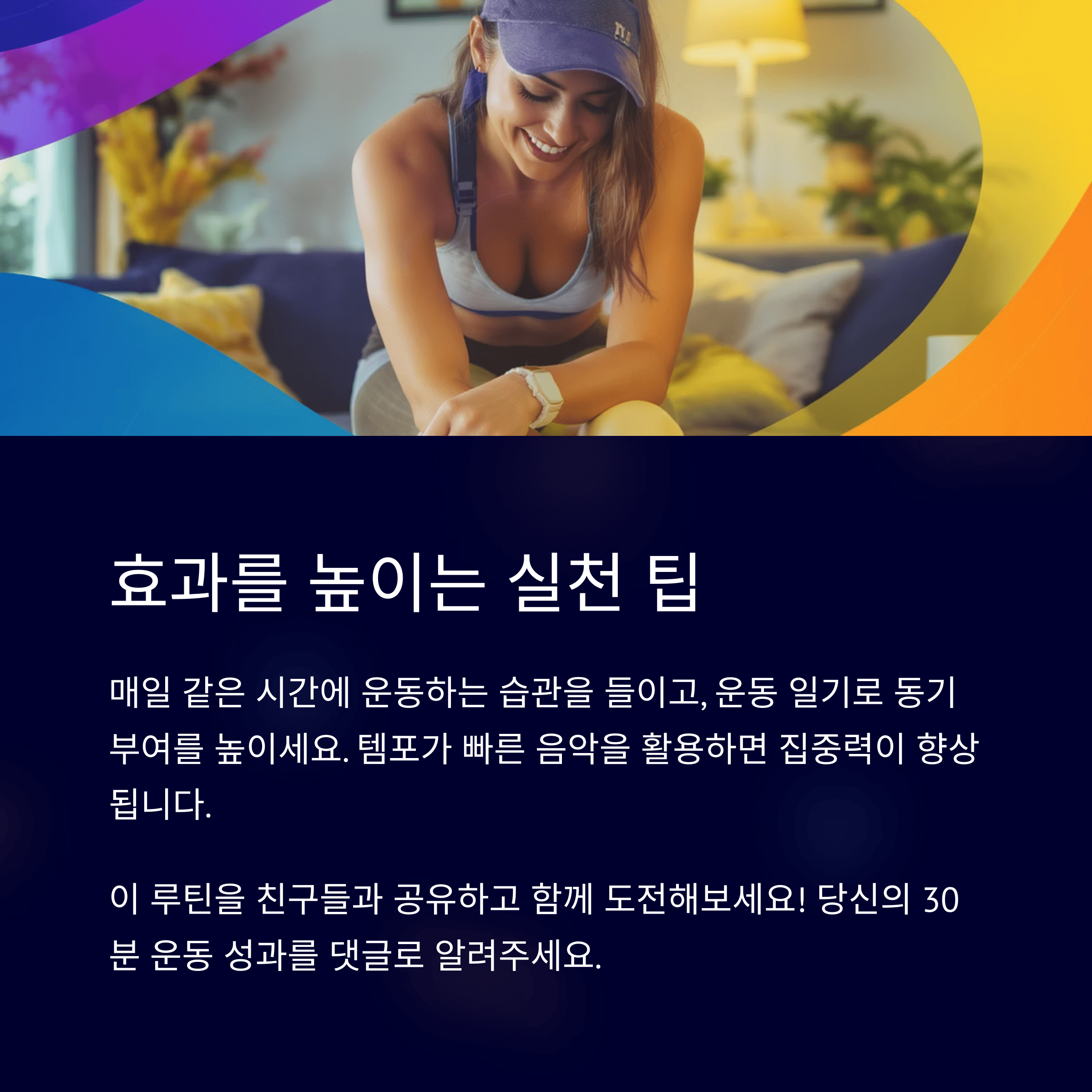 • 음악 활용: 템포가 빠른 음악을 들으며 운동하면 지루함을 줄이고 집중력을 높일 수 있습니다.