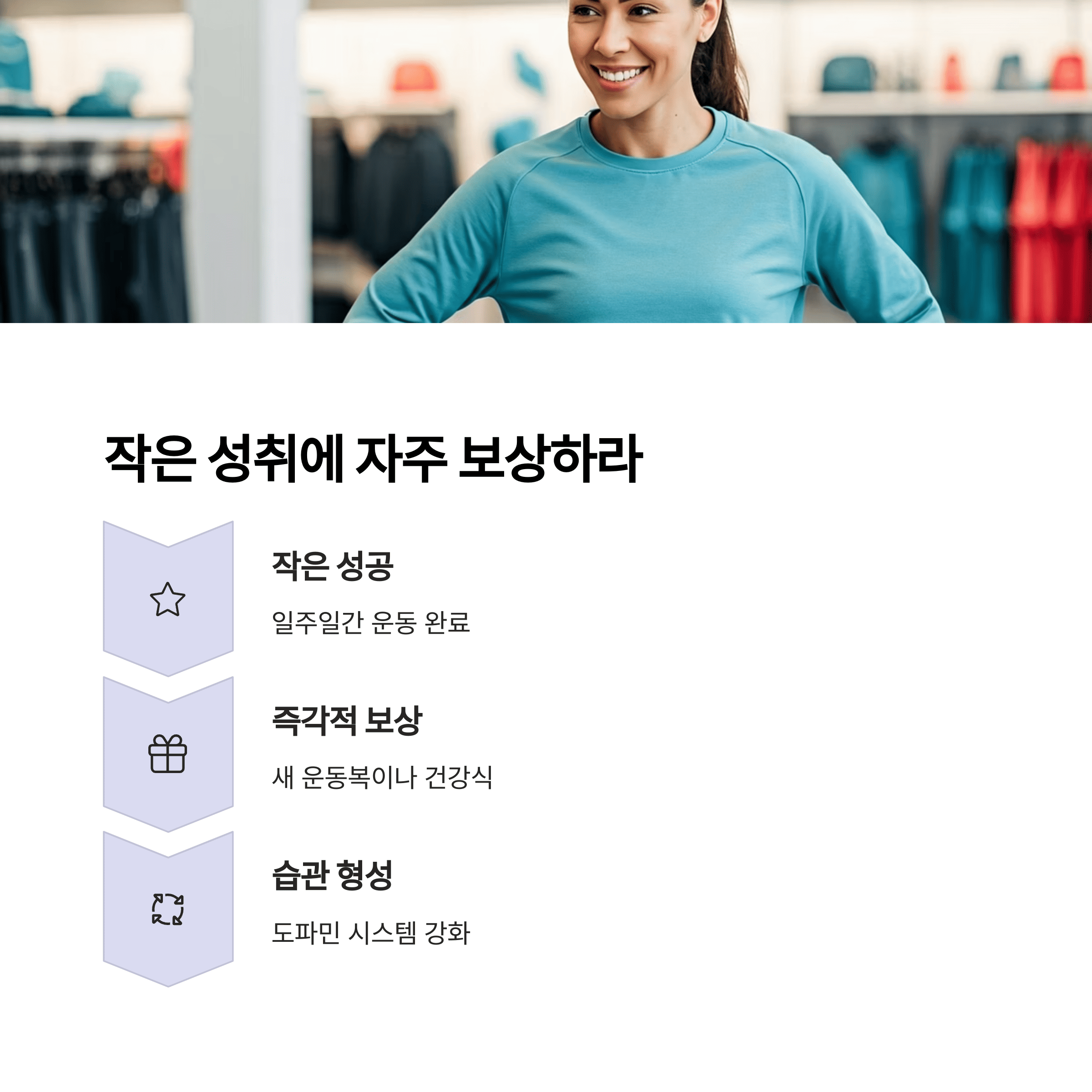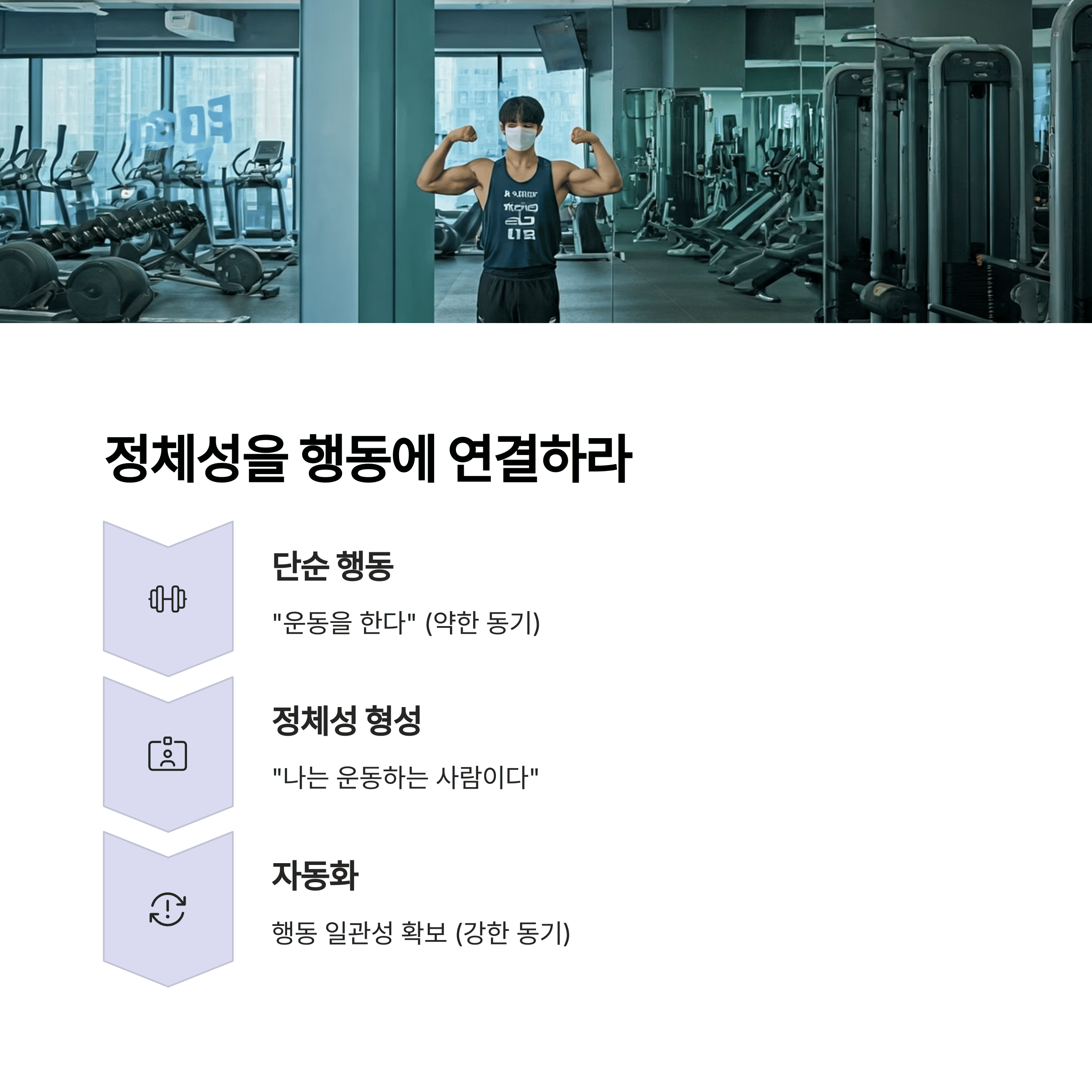 단순히 운동을 ‘하는 것’이 아니라, 운동을 ‘하는 사람’으로 인식하면 행동 일관성이 자동화됩니다.