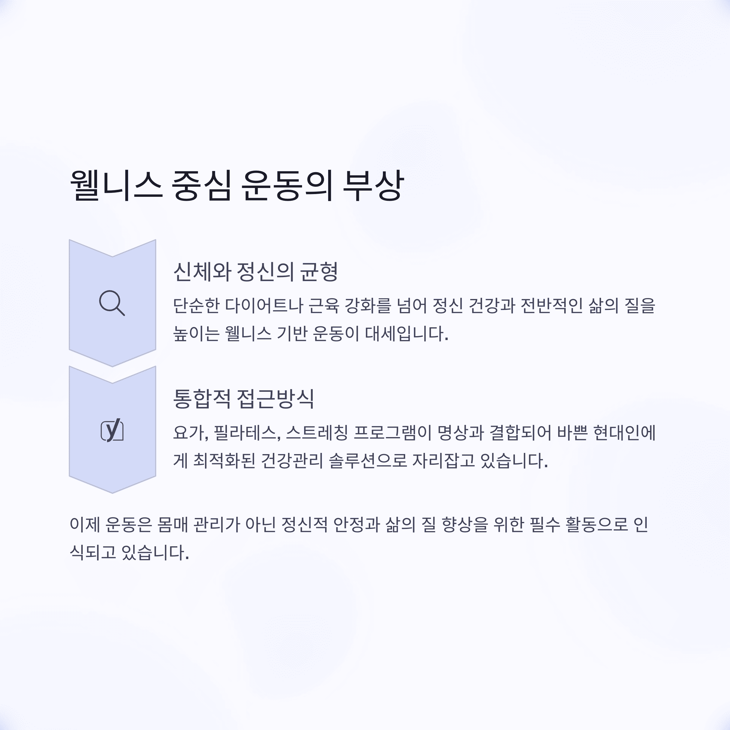 단순한 다이어트나 근육 강화 중심에서 벗어나, 정신 건강과 전반적인 삶의 질을 높이기 위한 웰니스 기반 운동이 대세입니다.
