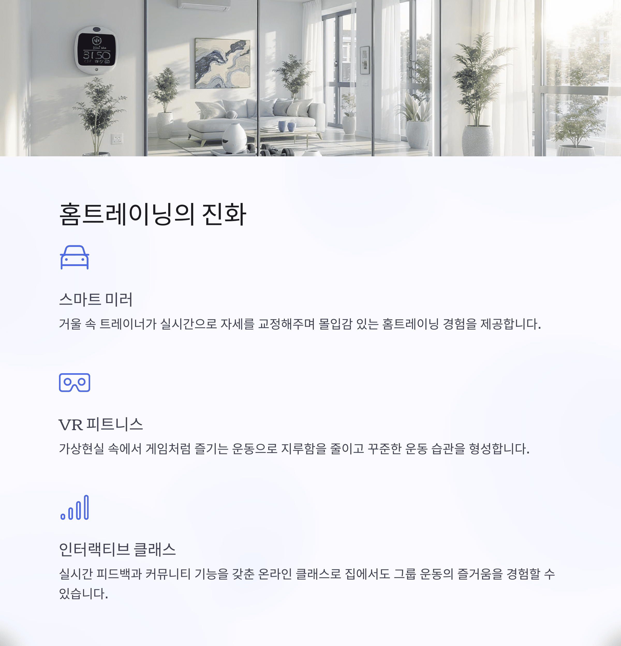 2025년에도 스마트 미러, 웨어러블 기기, 인터랙티브 온라인 클래스를 통해 집에서의 운동 경험은 더욱 향상되고 있습니다.