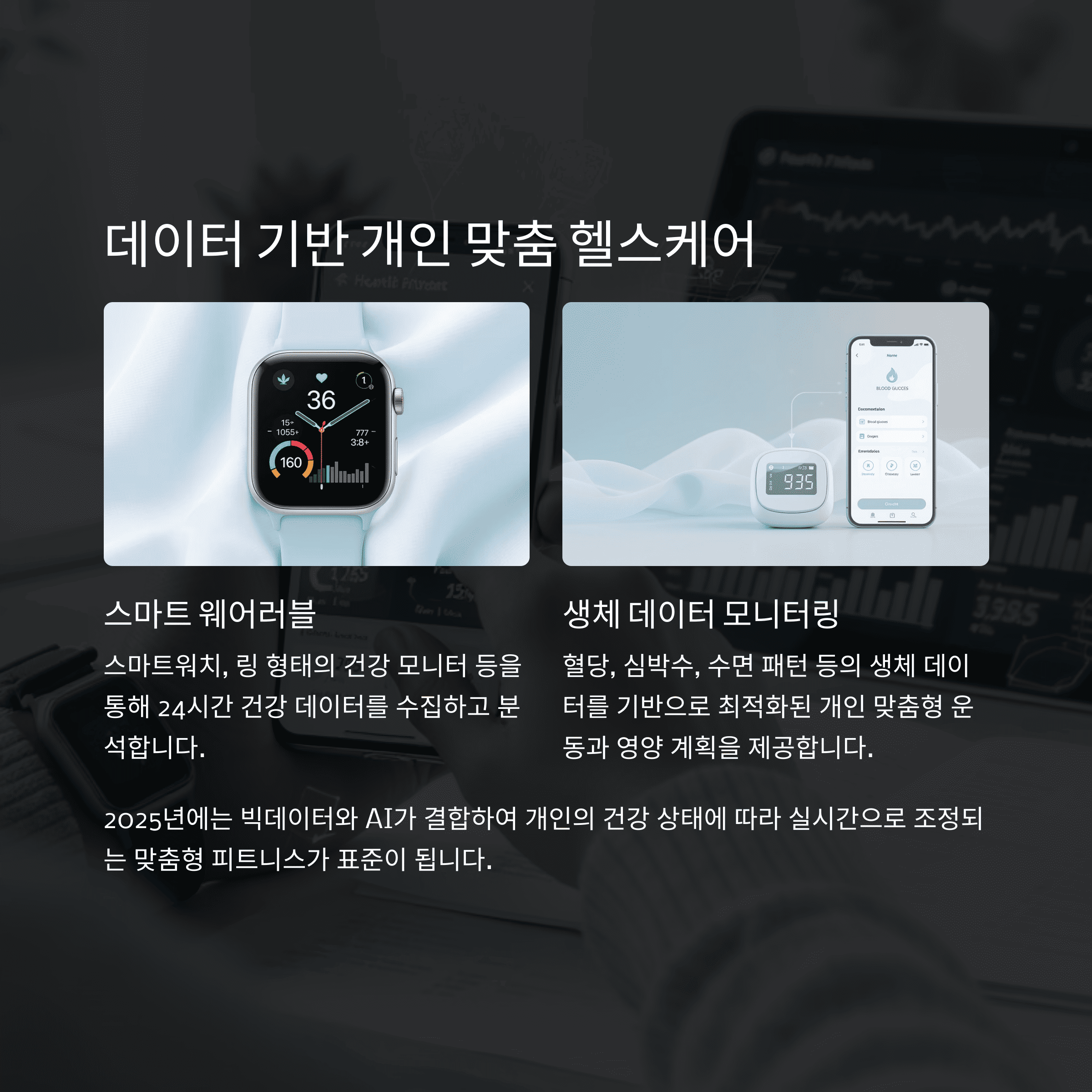 스마트워치, 혈당 측정기, 심박 센서 등의 웨어러블 기기를 통해 수집된 데이터는 운동 루틴 최적화, 영양 섭취 조절, 수면 패턴 분석 등 종합적인 건강관리에 활용됩니다.